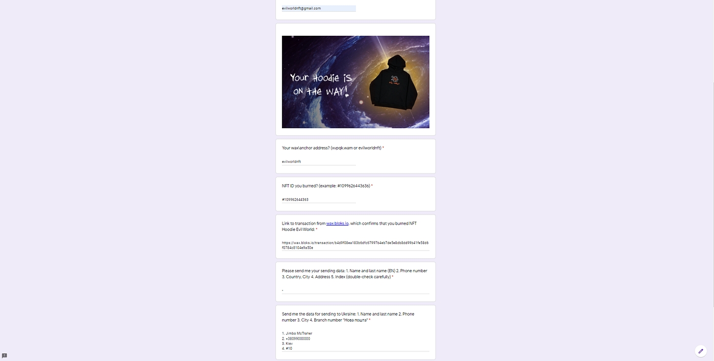 4. Заполнить актуальную форму всеми необходимыми данными: https://forms.gle/GGD1N6pya6aA5xWa9 [пример формы для получения Hoodie Evil World]